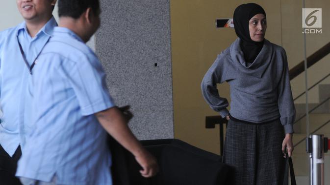 Adik Inneke Koesherawati, Ike Rahmawati usai menjalani pemeriksaan di KPK, Jakarta, Kamis (16/8). Ike diperiksa sebagai saksi terkait pemberian fasilitas, pemberian perizinan, ataupun pemberian lainnya di LP Kelas I Sukamiskin. (Merdeka.com/Dwi Narwoko)